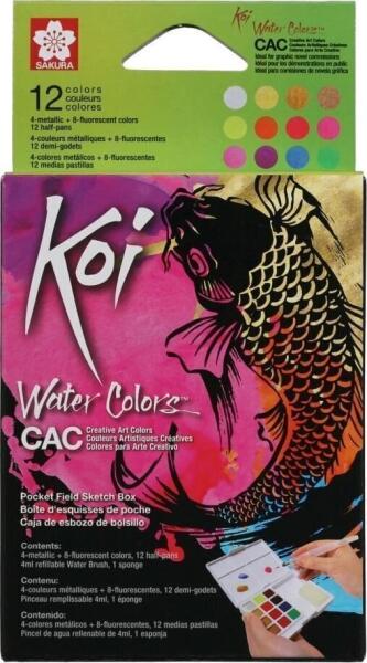 Ez egy automatizált szoftver általi fordítás:Akvarellfestékek. A készlet átlátszó akvarellfestékeket tartalmaz fél tégelyekben, kifejezetten fémes és fluoreszkáló árnyalatokban. A színek ideálisak illusztrációk, mangarajzok, kalligráfia vagy kreatív jegyzetek színezésére. A kompakt csomagolás könnyen elfér a zsebben, így praktikus az utazáshoz. Tartalmaz egy Koi Water Brush ecsettollat víztartállyal és szivaccsal. A kupak palettaként is használható. Átlátszó akvarellfestékek fél serpenyőkben, különleges metál és gyöngyházfényű színekben. Ideális mangák, illusztrációk, betűk festéséhez stb. A hordozható készlet könnyen elfér egy ing- vagy kabátzsebben. Tartalmaz egy Koi Water ecsetet, amely víztartállyal rendelkezik. A fedele palettaként is használható. 12 árnyalat: 4 metálos, 8 fluoreszkáló
